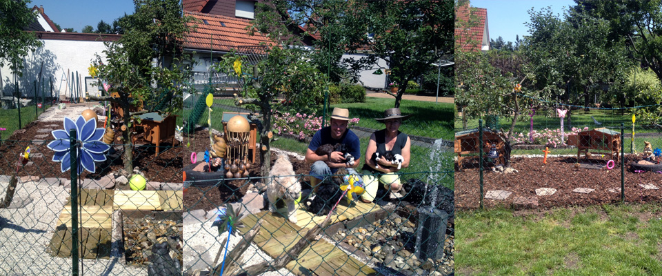Hier sehen Sie unsere Hunde in unserem schönen Garten beim Spielen mit den farbenfrohen Welpen aus den vorherigen Würfen: