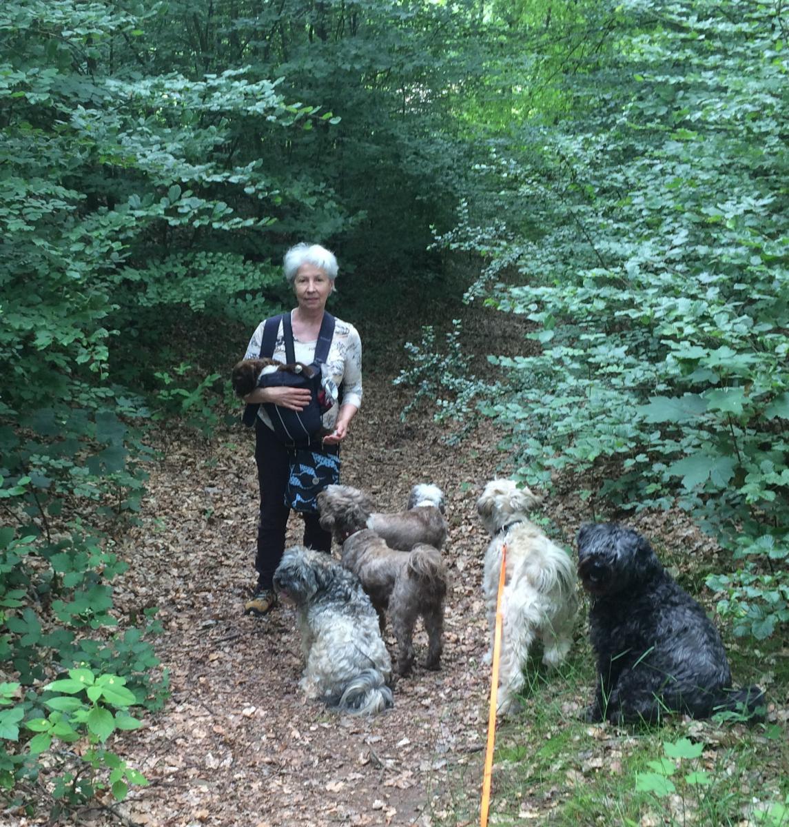 Mit dem Rudel und mit dem Baby, bis es zu seiner neuen Familie zieht, auf unserem täglichen Spaziergang durch den Wald.